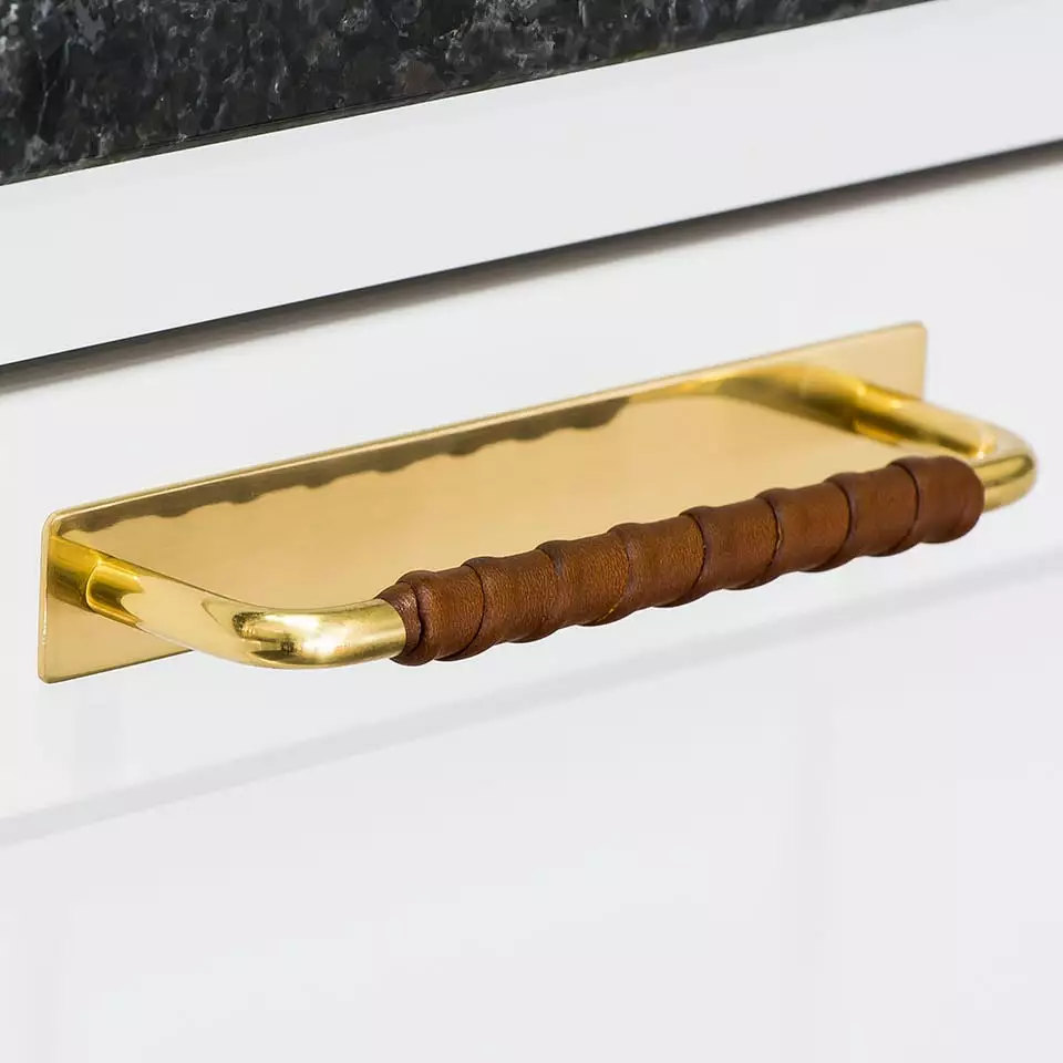 Geef je kamer wat extra luxe met deze klassieke handgreep omwikkeld met stijlvol leer. De leren handgreep is verkrijgbaar in zwart, bruin of natuurlijk leer in combinatie met gepolijst messing, onbehandeld messing of vernikkeld metaal.