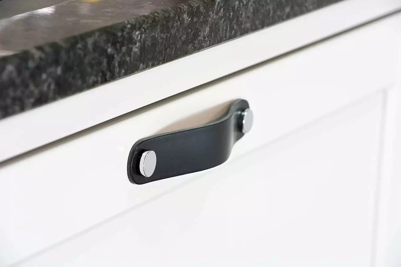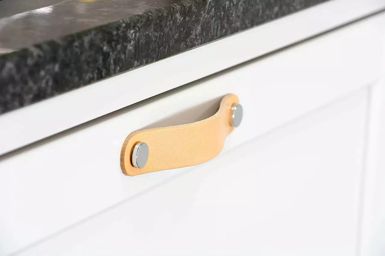 Loop handle comes from Beslag Design and has a tough and rustic look. The handle is made of high-quality leather that lasts a long time. Two round knobs adorn the luxury handle and are available in brass, copper, polished chrome and black metal combined with different leather colours.