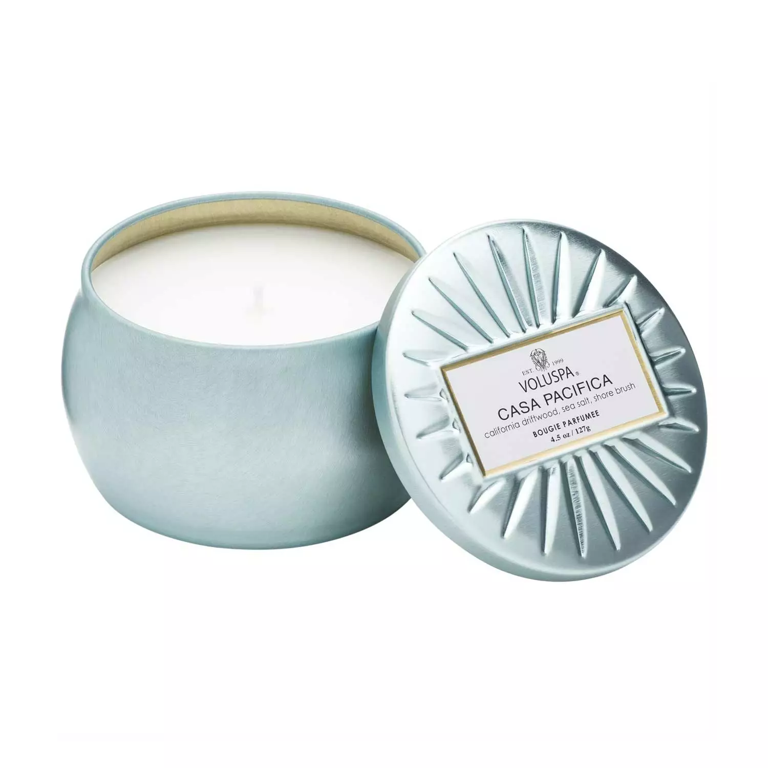 Petite Decorative Tin Candle from Voluspa. Filled with clean-burning coconut wax, these metallic tins are a gorgeous addition to any room. Burn time: 25 hours.